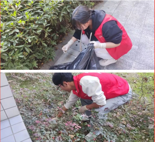 下午两点,十一名志愿者带好劳动工具,志愿者们穿上红马甲,分别对教学楼外围,教学楼花坛进行清理。志愿者奔向各自的任务点,完成规定好的任务。