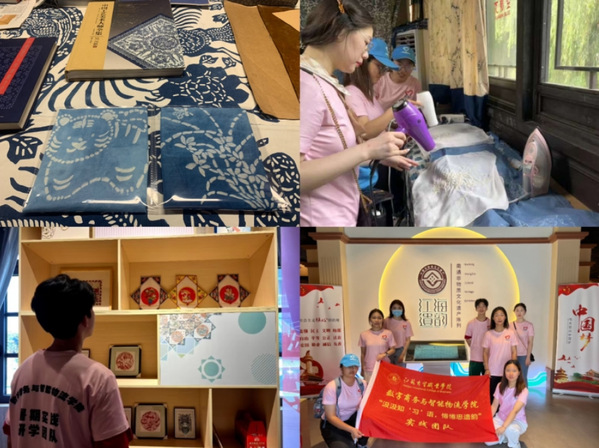 三、开展了“增强文化自信、传承‘非遗’文化”专题活动。6月22日实践团走近茶中文化,传承人顾媛媛和毛红美老师进行了茶艺表演,毛莉芳老师介绍了茶的历史渊源以及如何品味茶的过程,师生们感受到茶文化的博大精深,认识到发扬中华传统文化的重要性;7月26日至7月27日,实践团队前往蓝印花布博物馆、沈寿艺术馆和非物质文化遗产馆等地,在导员的带领下,实践团队深入了解蓝印花布的制作工艺和历史背景,亲手制作了独一无二的蓝印手工帕,观赏了南通板鹞、仿真绣、剪纸艺术等非遗作品,队员们在惊叹南通非物质文化遗产多达145项的同时,也被中华优秀传统文化的无穷魅力和深厚底蕴所震撼。
