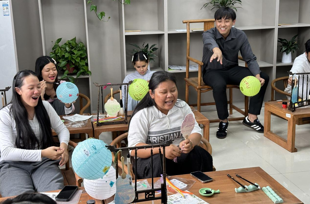 随后,相关辅导员老师们现场为留学生们演示了纸灯笼和漆扇的制作方法。