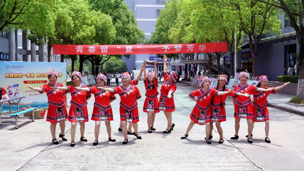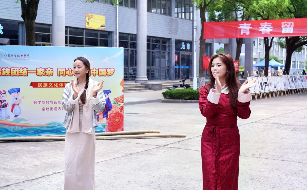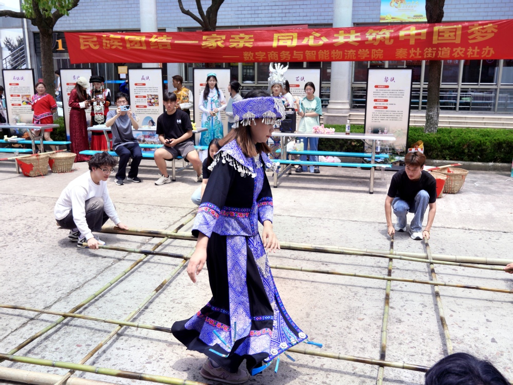 为进一步引导师生铸牢中华民族共同体意识,增强文化认同和文化自信,不断提升少数民族学生教育管理水平。6月14日,数字商务与智能物流学院联合秦灶街道农社办在学校食堂主干道举办了“民族团结一家亲,同心共筑中国梦”主题民族文化体验日活动,校党委委员、组织部部长穆丽娜,秦灶街道农社办副主任杨银慧,数字商务与智能物流学院党总支书吴佳庆、副院长邱春红,学院少数民族学生代表参加了此次活动。