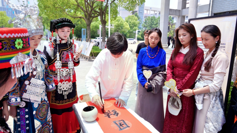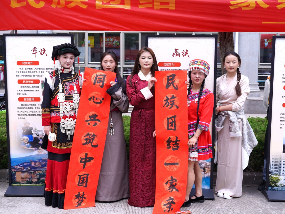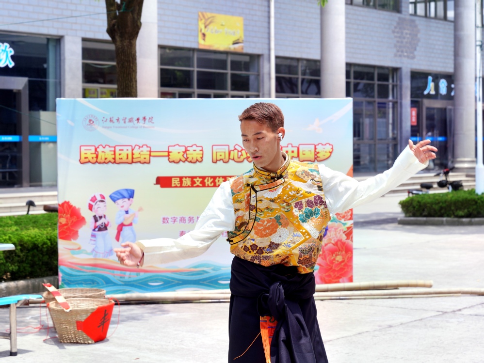 活动中各个少数民族载歌载舞,藏族学生跳起了精彩的锅庄舞;黎族学生展示了颇具民族特色的竹竿舞;秦灶街道农社办的十几位舞蹈老师以土家族的舞蹈拉近了与同学们的距离;侗族的罗老师现场书写对联,以书法的形式对民族团结精神的表达。活动现场还摆放了以民族简介、民族美食、民族服饰特色等为内容的展板,让同学们能够近距离了解少数民族文化特色,并进行了民族文化知识有奖竞答,调动了同学们学习各民族文化的兴趣。