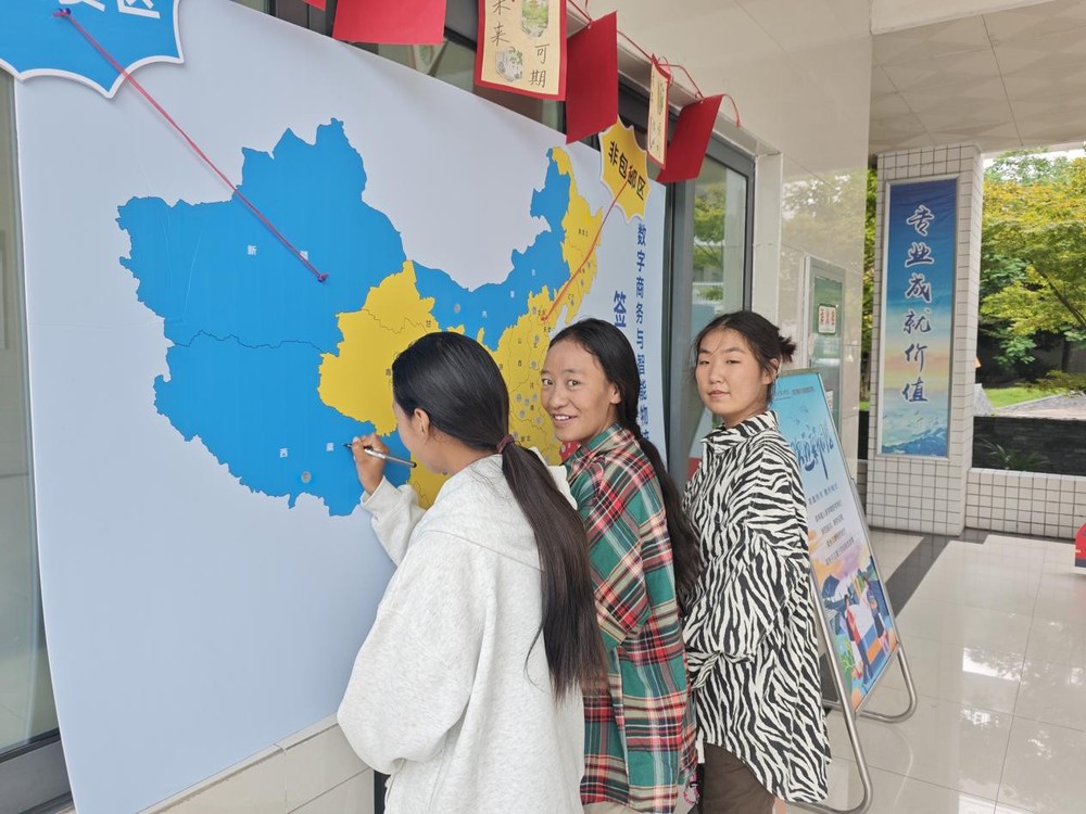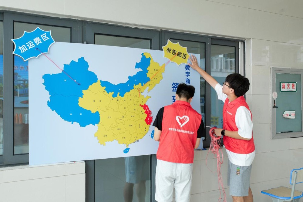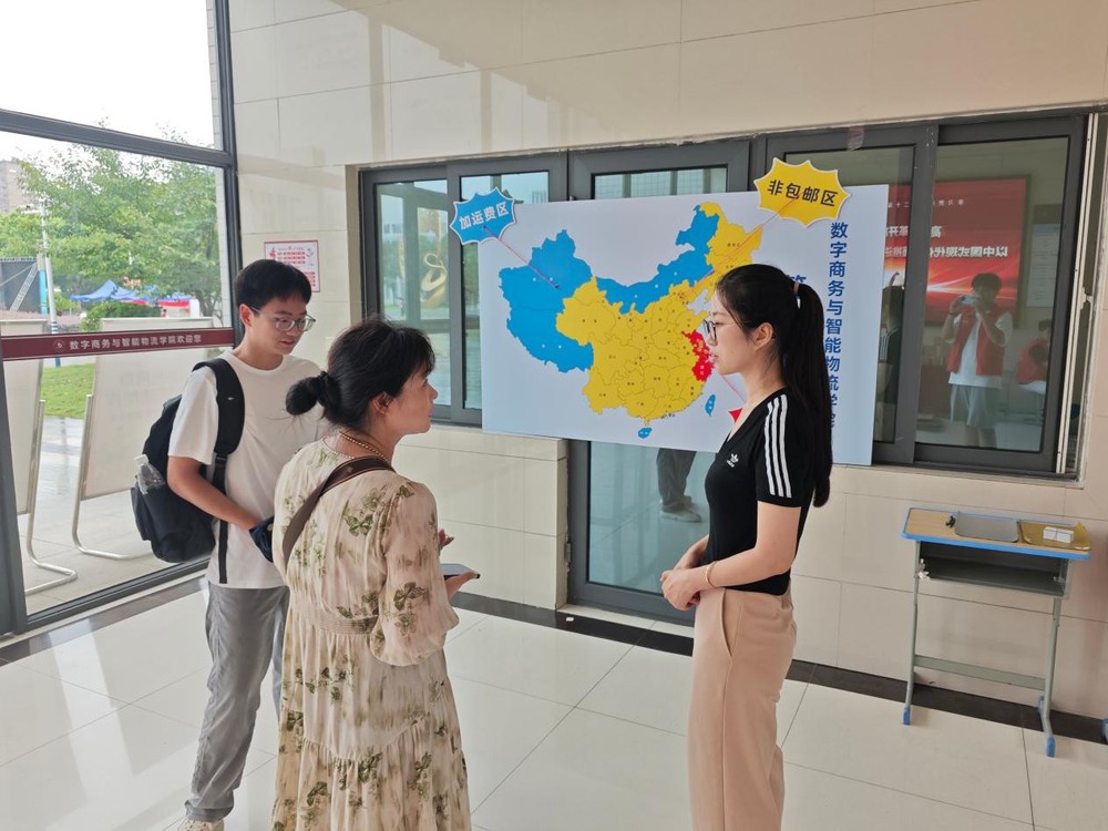 进入学院门厅,首先映入眼帘的是创意十足的打卡处,供学生和家长们自由拍照留念,记录下这一段珍贵的开学之旅;门厅左侧设置了特色签到墙,来自五湖四海的同学们,在印有中国地图的签到墙上找到自己家乡的位置并贴上签名标签,通过颜色对包邮、非包邮地区的划分,让同学们对物流配送区域有了初步的认识;新同学将自己对未来的期待写在心愿卡片上,塞入“青春邮筒”,寄给三年后的自己。值得一提的是学院还准备了诸多迎新礼物,有开学必备的洗漱礼盒,有学习耳机和护眼台灯,更有印着迎新主题和学院名称的记事本。