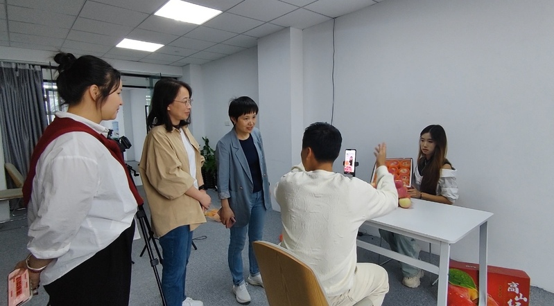 随后,师生们现场观摩了学院学生在企业直播间进行的电商直播实践。学生们在企业技术人员的指导下,能够熟练地完成直播脚本的编写、直播间搭建、运用专业知识进行产品介绍、互动答疑,展现了良好的职业素养和实战能力。