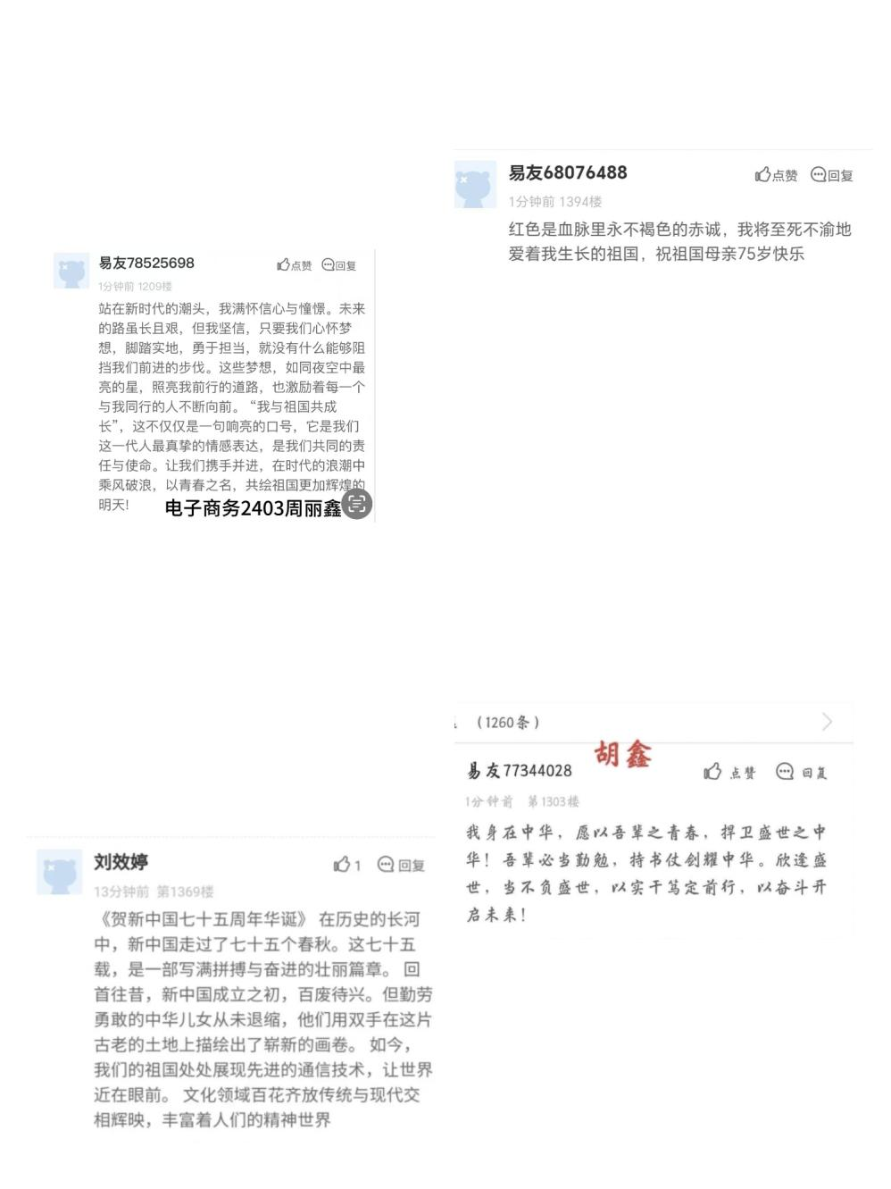 发表高质量评论,激发民族自豪感。我们生在红旗下,长在春风里。为坚定学生理想信念,学院鼓励学生参与易班网活动。学生或表达自己的冀愿“携手并进,在时代的浪潮中乘风破浪”;或坚定己身“吾辈必当勉励,持书仗剑耀中华”;或歌颂祖国科技发展迅速,“让世界近在眼前”。全校40个班级积极发表高质量评论,同心祝愿祖国繁荣昌盛。
