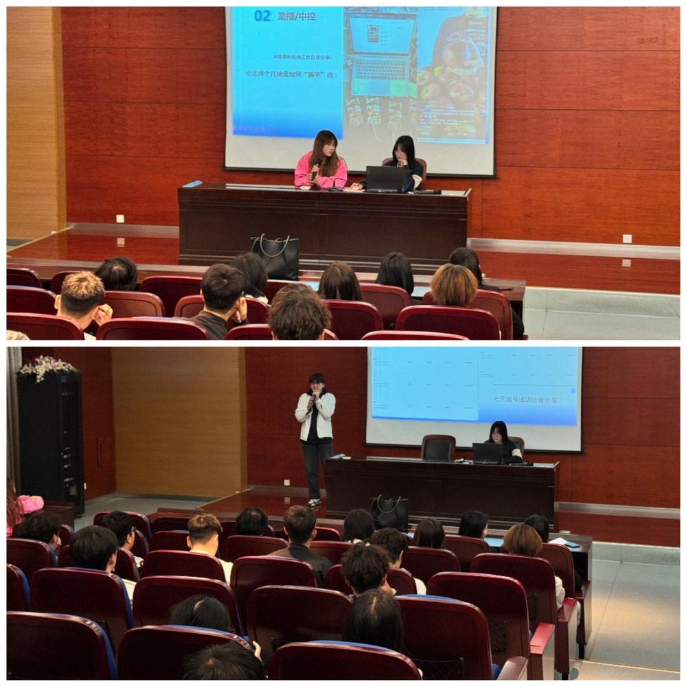 紧接着,课程进入了实践分享高潮。本院跟岗实习的学生代表纷纷上台分享了他们在企业直播实践过程中的亲身经历和深刻感悟。他们借助鲜活的日常实践案例,不仅展示了直播实习学习的丰硕成果,还深刻分享了个人在实习过程中的成长心得与蜕变历程,为在场的师生呈现了一场充满启发与思考的分享交流。
