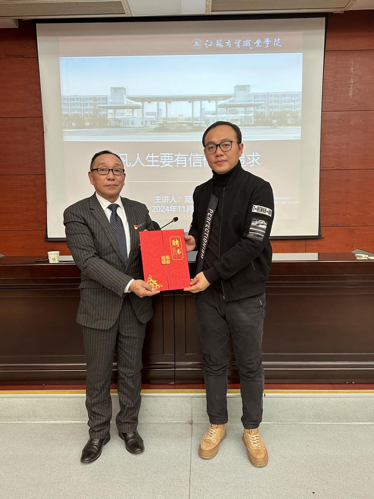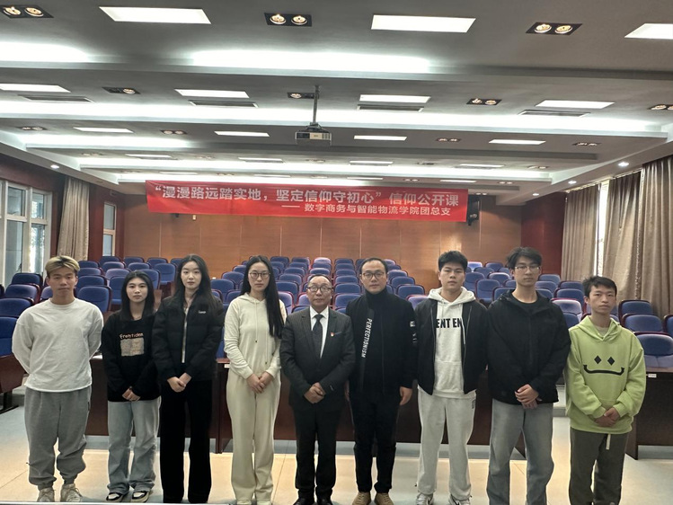 信仰公开课结束后,学工办主任胡成旭为陆书记颁发数字商务与智能物流学院“青年成长导师”聘书。