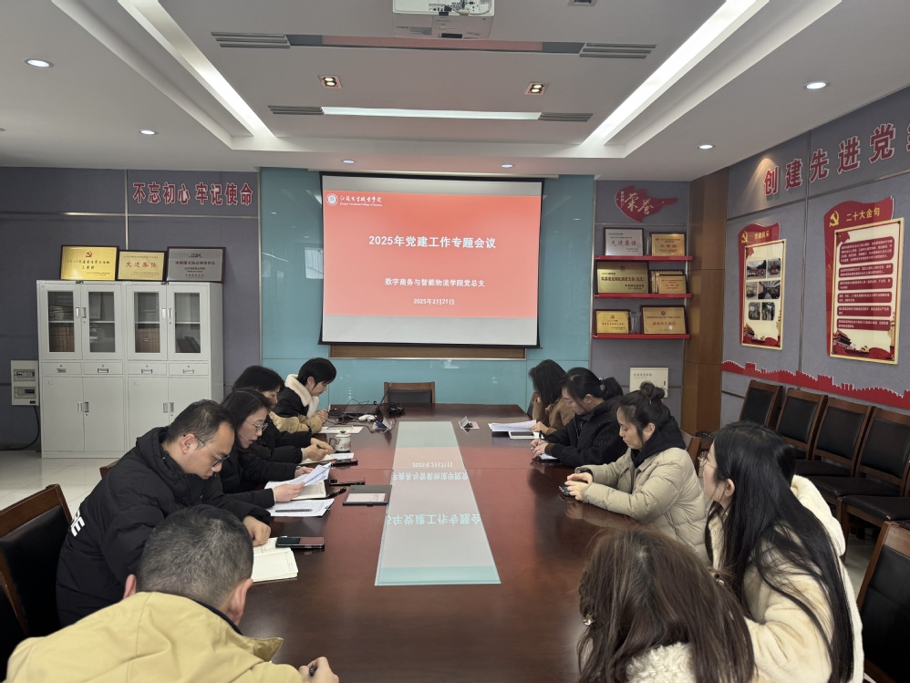 2月21日下午,数字商务与智能物流学院党总支在2号楼306会议室召开2025年党建工作专题会议。学院领导班子成员、党总支委员、各党支部书记、委员参加会议,会议由学院党总支书记吴佳庆主持。