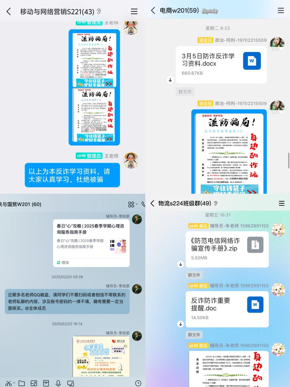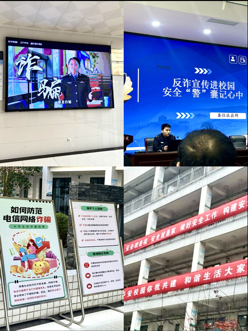 线上线下齐发力反诈宣传全覆盖。学院创新宣传形式,组织全体学生集中观看反诈警示视频,教学楼大厅电子大屏每日滚动播放反诈短视频,展板宣传反诈方式方法,微信公众号定期推送反诈案例和知识;辅导员利用班级群推送《防诈知识每日一图》,形成"视听结合、全员参与"的宣传矩阵;联合辖区派出所开展反诈专题讲座,结合"刷单返利"、"虚假征信"等典型诈骗案例,剖析诈骗手段,营造“人人知反诈、人人懂防范"的浓厚氛围,提升学生识诈防诈能力。