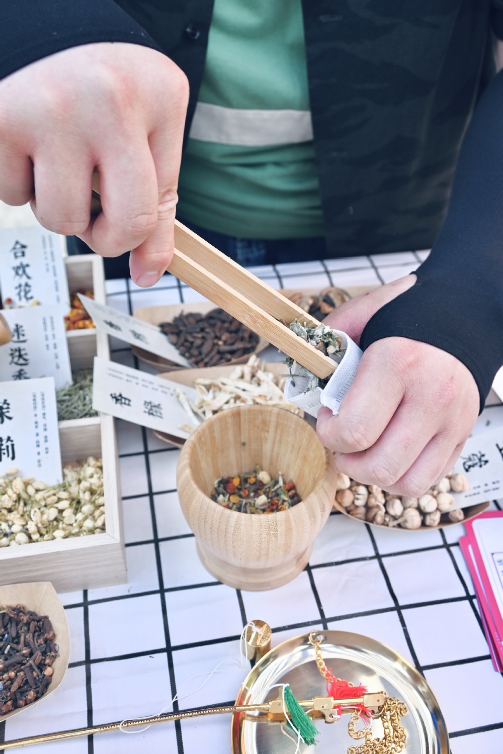 在弥漫着淡淡药香的“中医药连连看” 区域,印着当归、远志、合欢皮等草药图案的卡牌整齐排列。同学们两两搭档,在限时配对中比拼眼力:“快看!这味‘合欢皮’对应‘疏肝解郁’,和刚才情绪处方里的建议好像!” 随着一对对草药成功配对,围观者也跟着记住了“远志安神、陈皮理气” 的小知识。集满通关印章的同学还能兑换艾草香囊、中药明信片等文创奖品,让传统文化的芬芳实实在在地捧在手心。