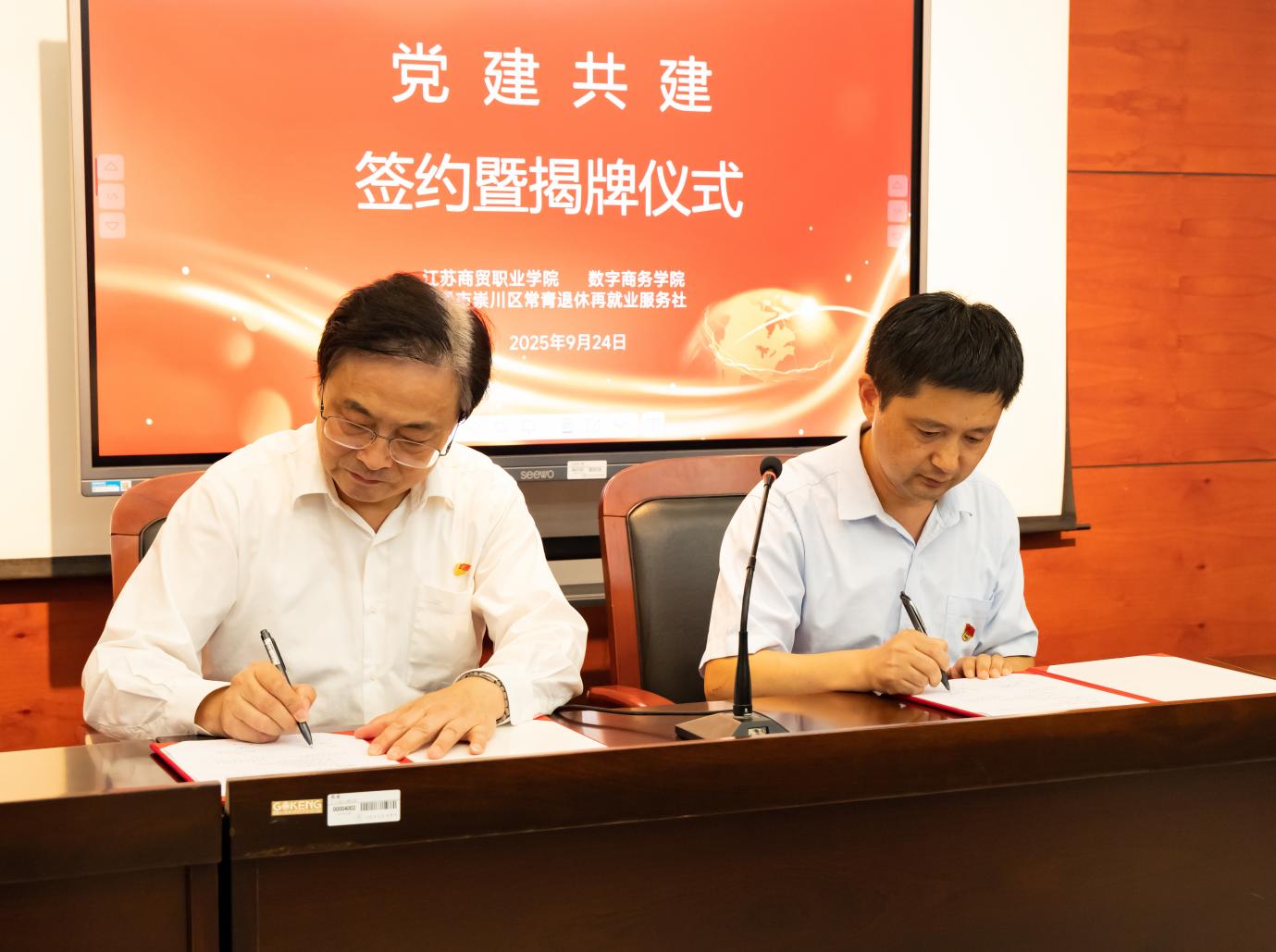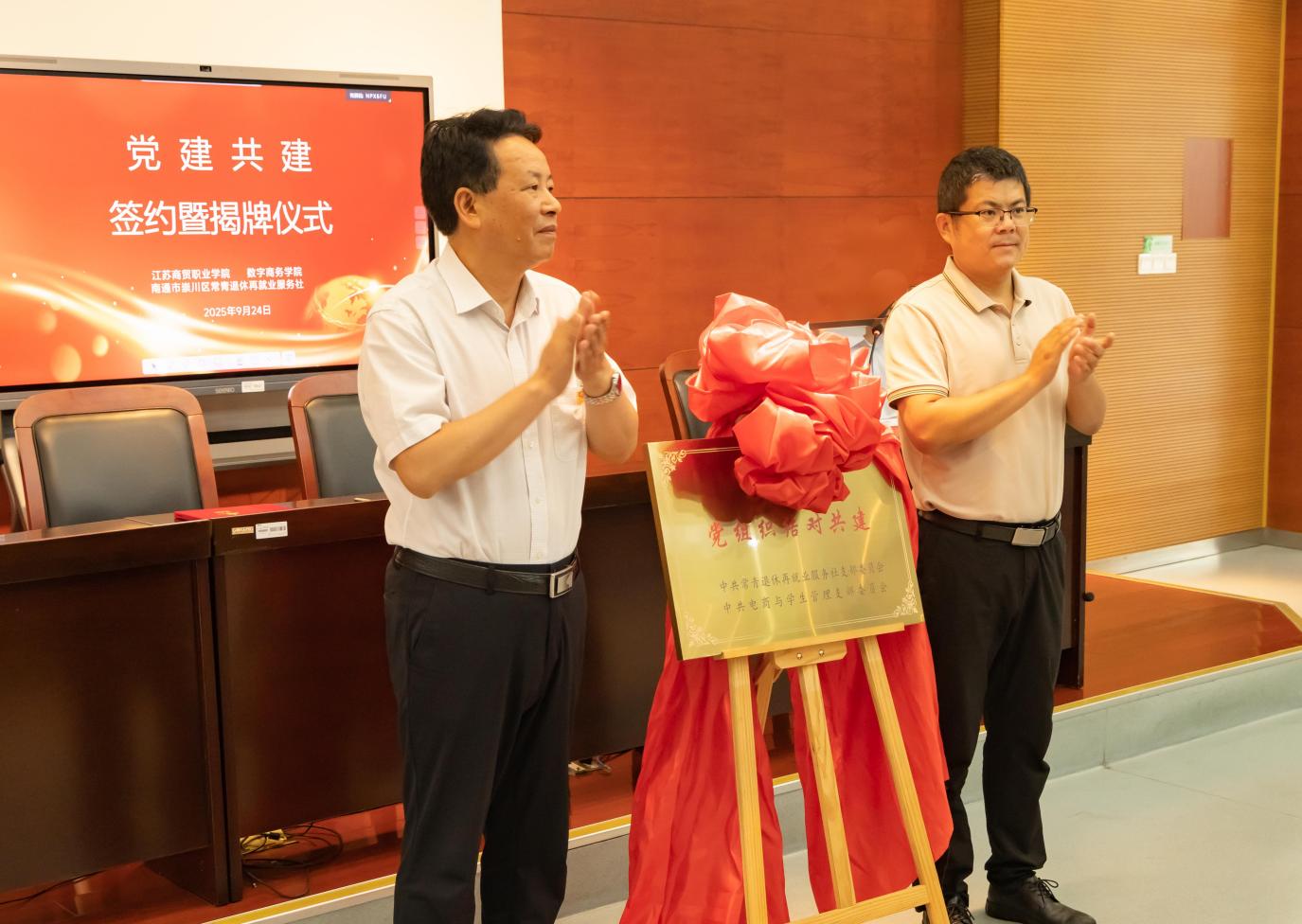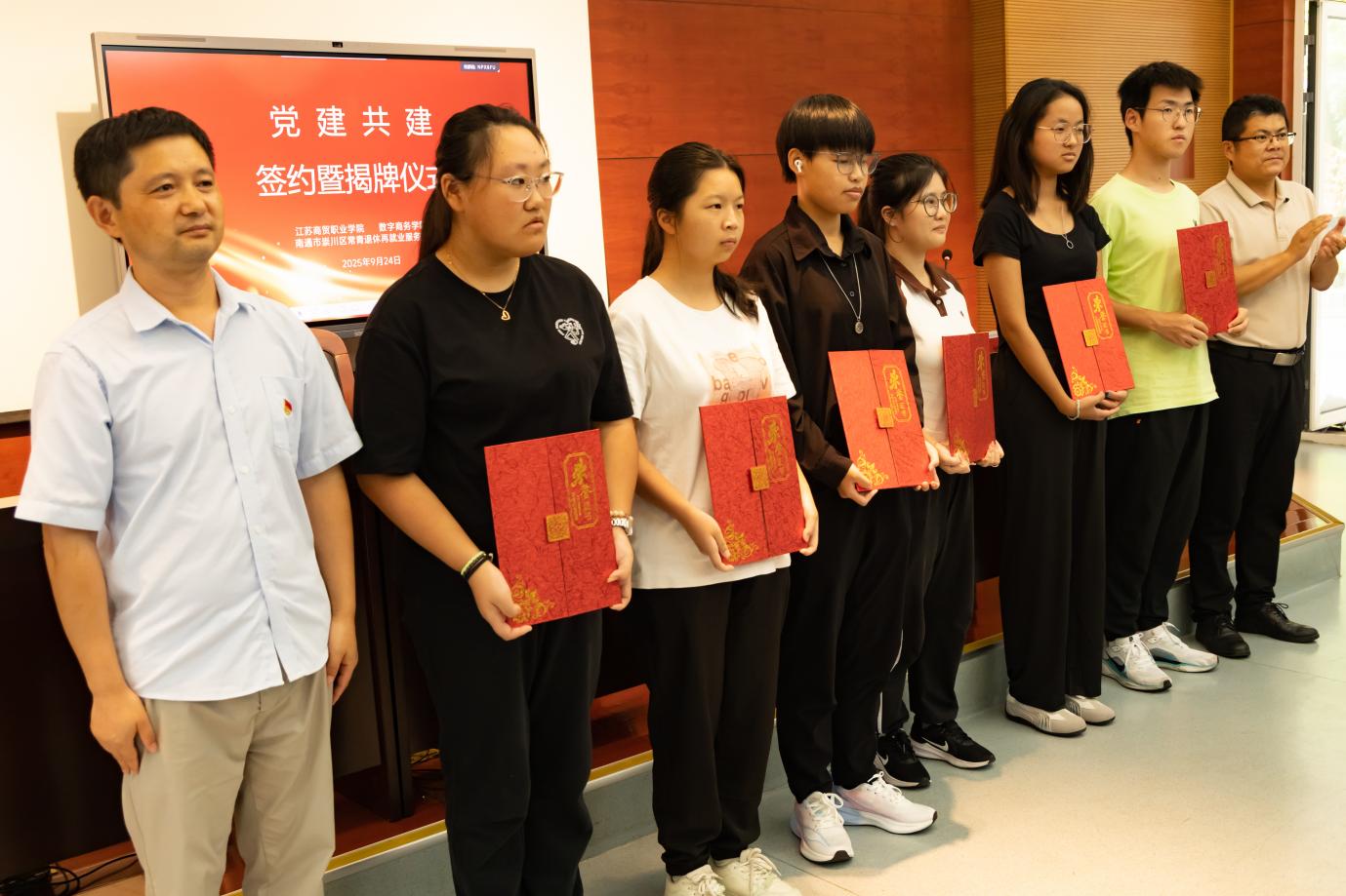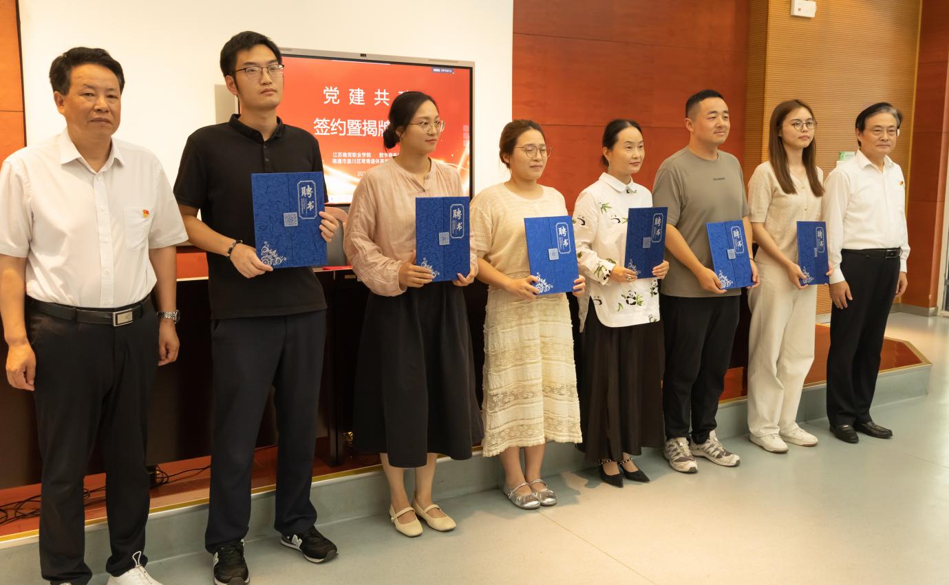 暖场宣传片的循环播放,率先向在场师生展现了本次活动的核心目标与校社联动的支持力量,为活动拉开温情序幕。活动中,双方党支部书记共同签署合作协议,并举行了“支部共建”揭牌仪式;南通市崇川区常青退休再就业服务社为我院职业规划指导老师颁发聘书;学院为暑期参与“零失业”社区社会实践志愿服务活动的六名同学颁发“优秀志愿者”荣誉证书。据悉,这六位同学在暑期顶着酷暑深入社区,完成1000 余户居民就业情况调研,以实际行动助力“零失业”社区建设,他们的实践精神获得在场师生的热烈掌声。