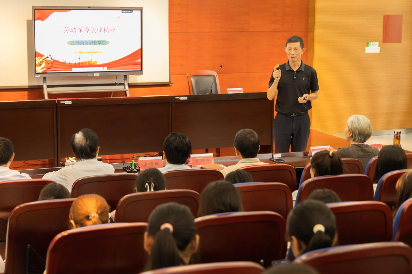 讲座中,陈新结合“青春职达 —— 崇川区高校毕业生‘培力赋能’专业支持项目”实践经验,以真实典型案例导入,围绕劳动合同签订、工作时间约定、劳动报酬支付、社会保险缴纳四大板块内容,对《江苏省劳动合同条例》《国务院关于职工工作时间的规定》等法规要点进行深度讲解,内容兼具专业性与实用性,现场反响热烈。互动答疑环节仲,同学们围绕“实习协议与劳动合同的区别”“社保断缴影响”“试用期工资标准”等问题踊跃提问,陈新逐一耐心解答,用通俗语言化解法律知识的晦涩,进一步强化了学生的法治认知与权益保护意识。
