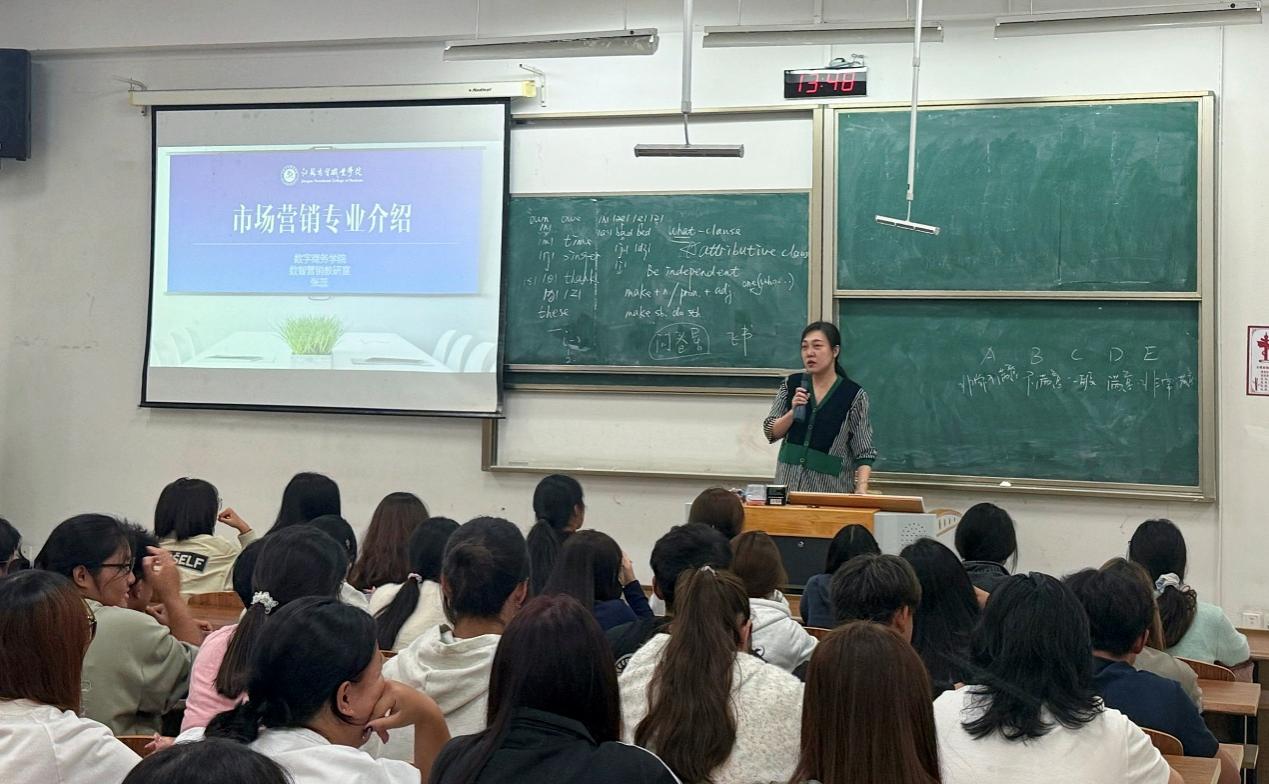 张蕊详细介绍了市场营销专业的办学历史、专业课程体系、师资力量和实践教学平台。她指出,在当今数智时代,大数据、人工智能、区块链等新兴技术正深刻改变着营销格局。学校市场营销专业紧跟时代步伐,聚焦“数智营销与传播”新定位,致力于培养具备扎实数智能力、创新思维和社会责任感的复合型人才。她鼓励新生要不断学习新知识、新技能,掌握数据分析工具、熟悉社交媒体营销策略,努力成长为从事商品或服务策划和销售管理等工作的高素质技术技能人才。