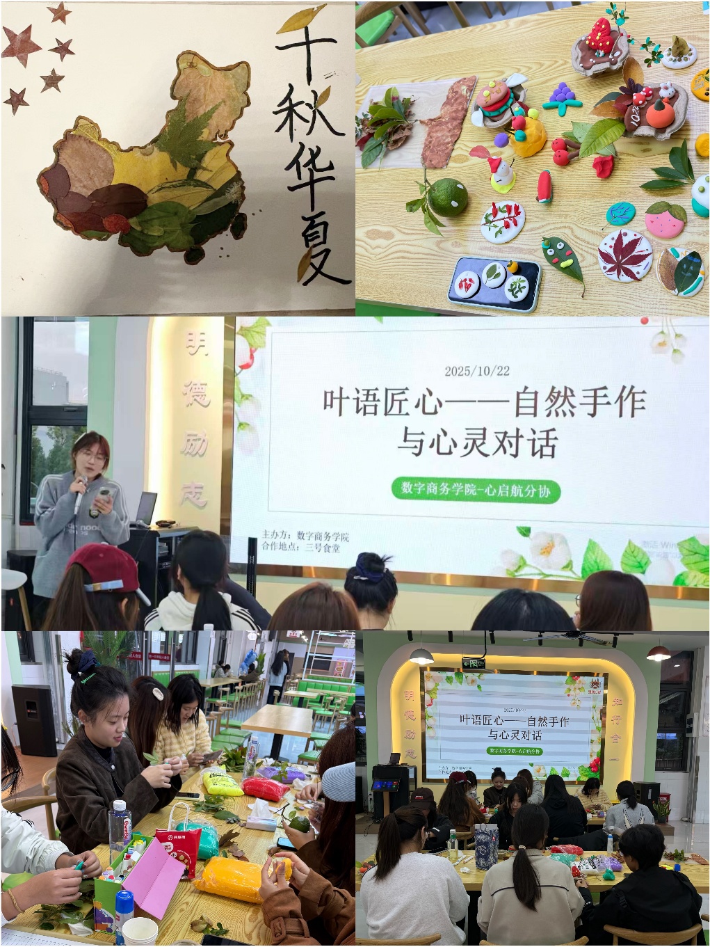 随后,大家齐聚南食堂二楼文化厅,开展落叶手作活动。同学们充分发挥创意与想象,将普通的落叶拼成可爱的小动物、浪漫的花朵、温馨的校园场景;还有的同学在落叶上写下对自己的期许、对家人的思念。指尖翻飞间,一片片落叶蜕变成充满心意的艺术品;欢声笑语中,新生们在与自然的亲密互动中放松心情,真切感受到校园生活的美好与温暖。