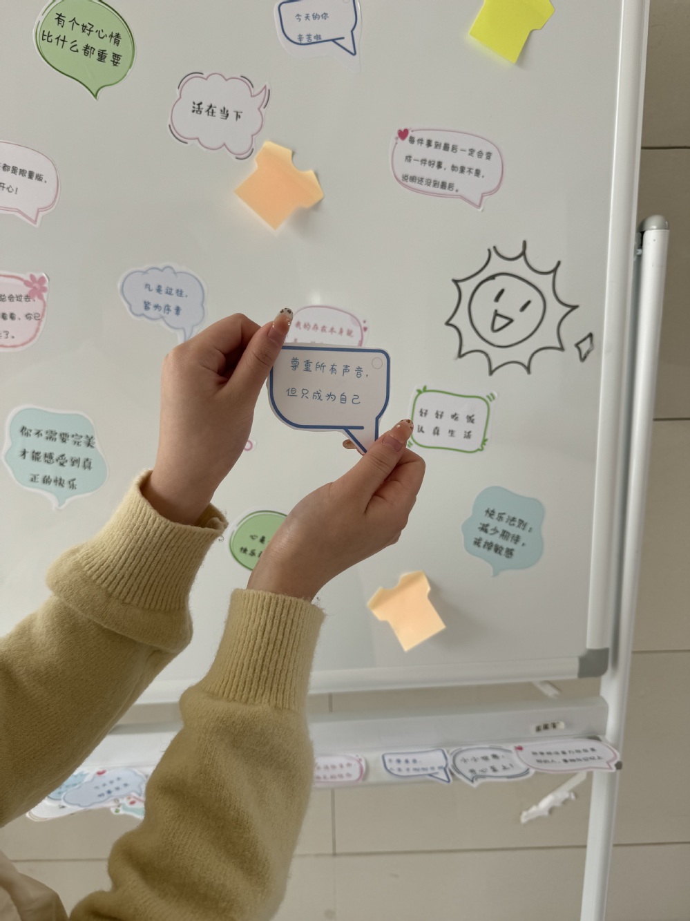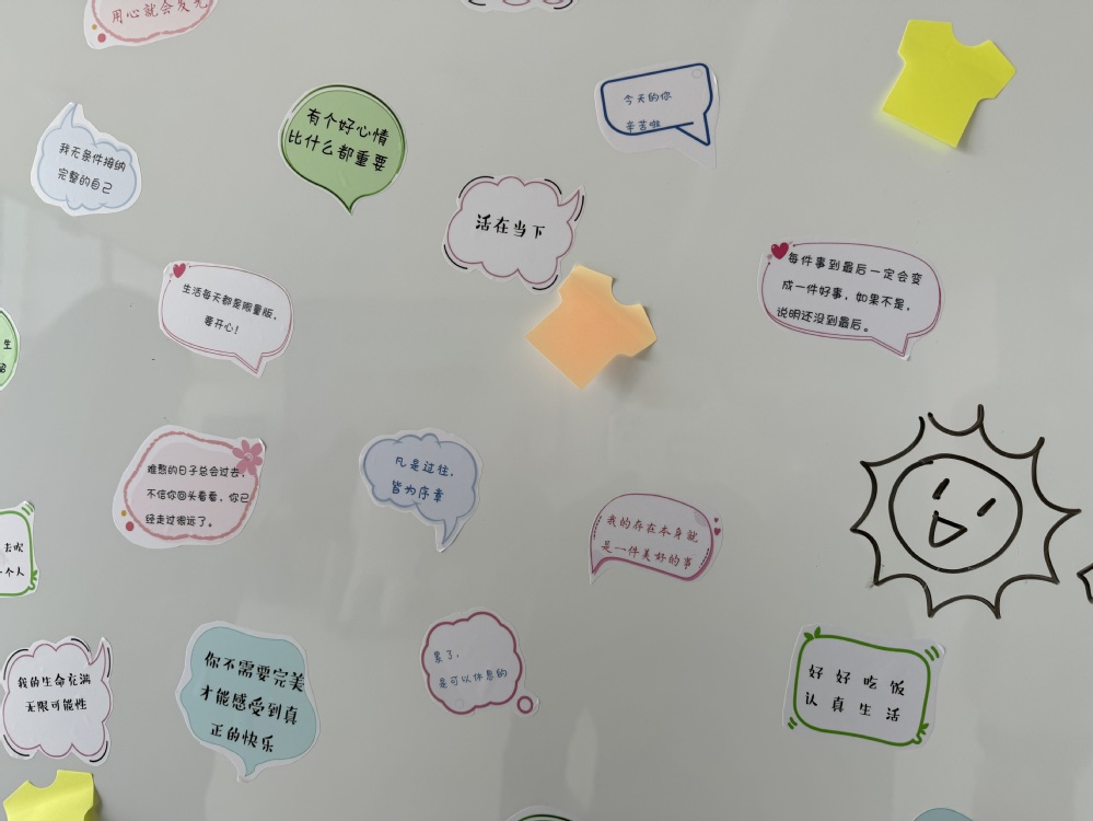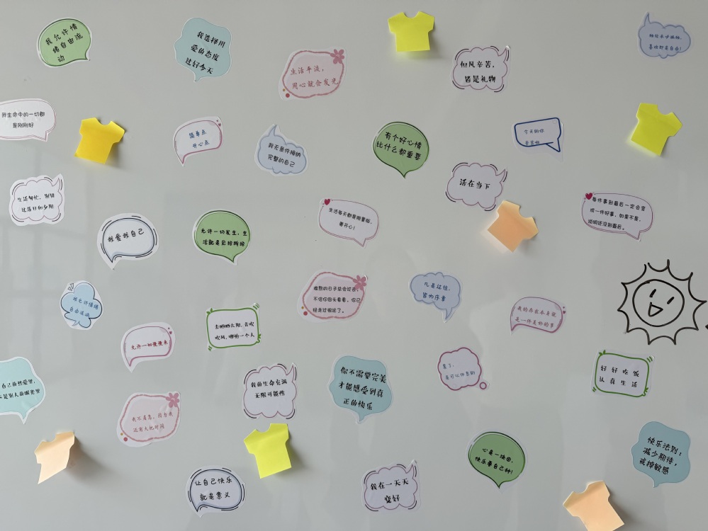 幸福能量墙前同样热闹非凡,同学们将心中的心愿、真诚的鼓励与暖心的祝福落笔于便签之上,一张张便签贴满整面展板,让平凡的墙面成为治愈人心的“情绪树洞” 与传递善意的 “温暖驿站”。一句句质朴又暖心的文字,让同学们在情感共鸣中汲取前行勇气,真切感受被理解、被治愈的校园温情。